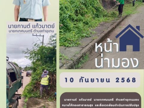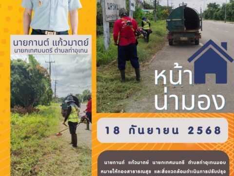 18 กันยายน 2568 นายกานถ์ แก้วมาตย์ นายกเทศมนกรี ตำบลท่าอุเทนมอบ หมายให้กองสาธารณสุข และสิ่งแวดล้อมดำเนินการปรับปรุบปรุง ภูมิทัศน์ ถัดกิ่งไม้ ถัดหญ้า ณ ถนนเส้น2027 เพื่อความ สะอาถและความเป็นระเบียบเรียบร้อย