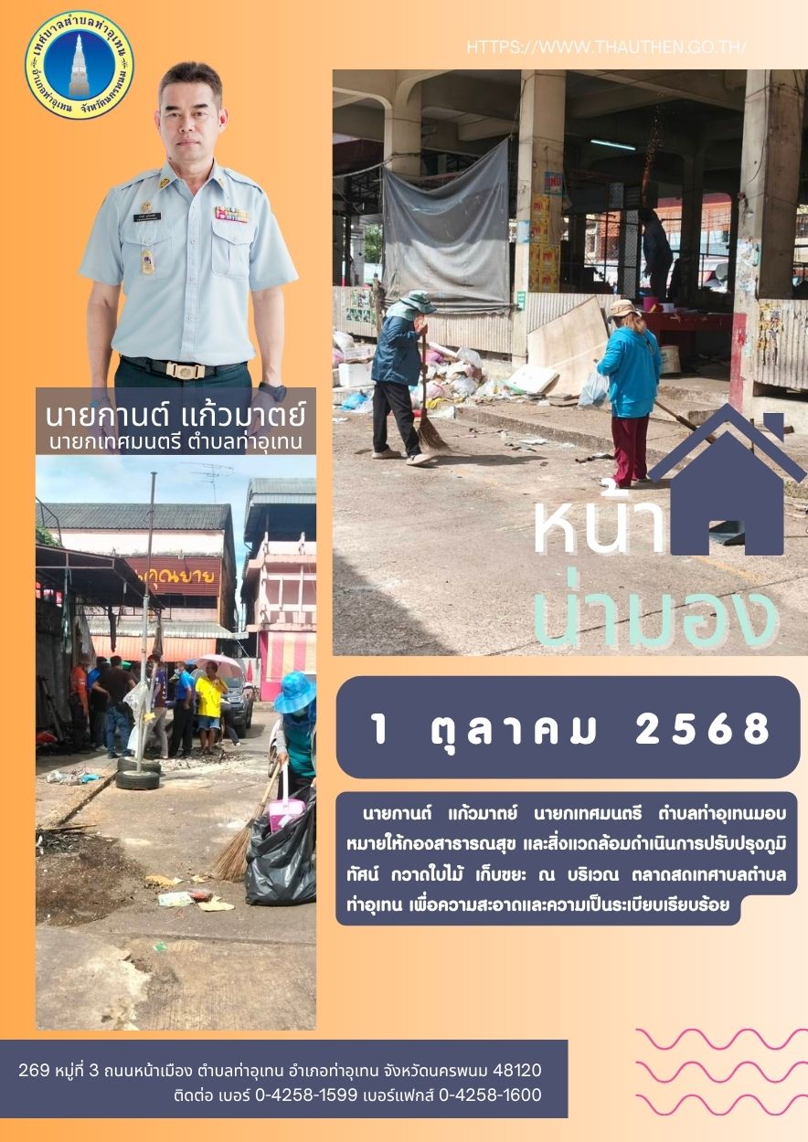 ← 18 กันยายน 2568 นายกานถ์ แก้วมาตย์ นายกเทศมนกรี ตำบลท่าอุเทนมอบ หมายให้กองสาธารณสุข และสิ่งแวดล้อมดำเนินการปรับปรุบปรุง ภูมิทัศน์ ถัดกิ่งไม้ ถัดหญ้า ณ ถนนเส้น2027 เพื่อความ สะอาถและความเป็นระเบียบเรียบร้อย